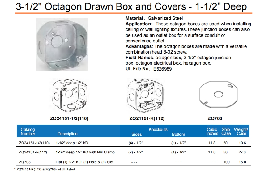 Field Names: octagon box, 3-1/2" octagon junction box, octagon electrical box, hexagon box.
