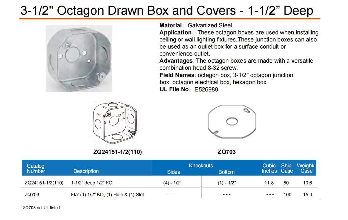 Field Names: octagon box, 3-1/2" octagon junction box, octagon electrical box, hexagon box.