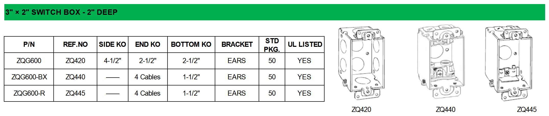 • 3″x 2″ Switch boxes can be installed in walls or ceilings for lighting fixtures, switches, receptacles or other outlet devices