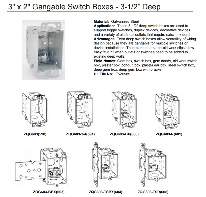 Field Names: Gem box, switch box, gem dandy, old work switch box, plaster box, conduit box, plaster ear box, steel switch box, deep gem box, deep gem box with bracket.