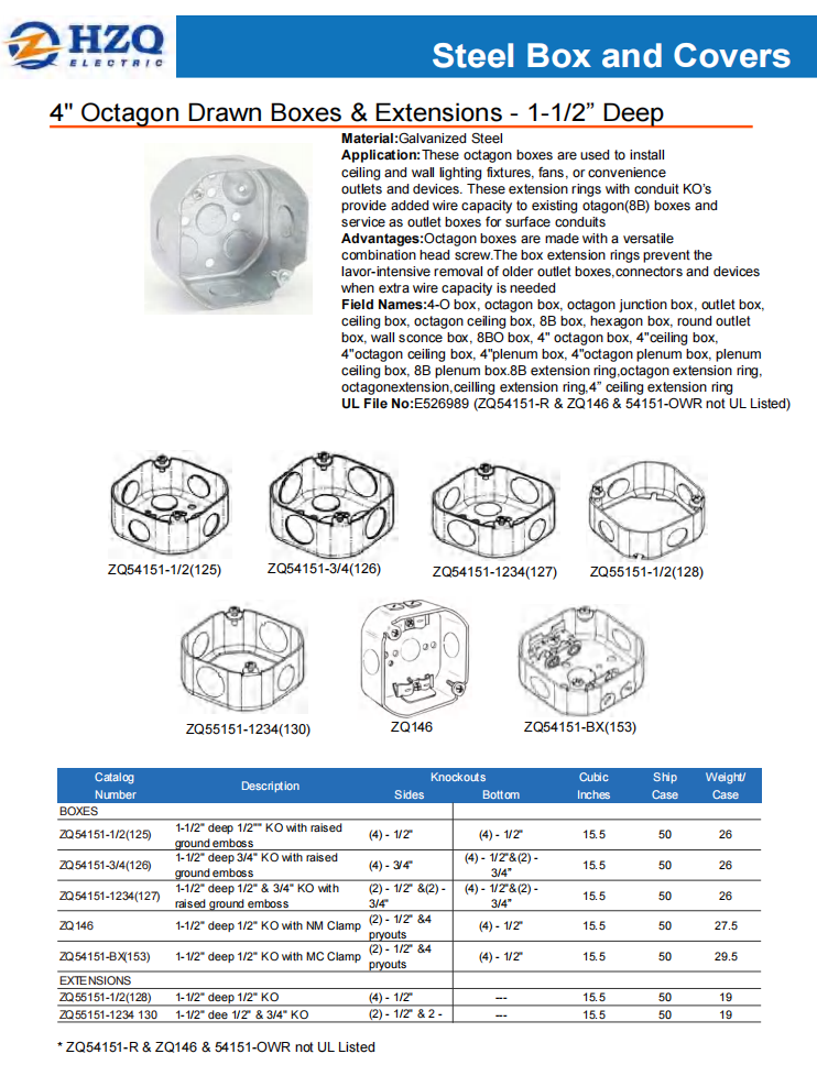 Field Names: 4-O box, octagon box, octagon junction box, outlet box, ceiling box, octagon ceiling box, 8B box, hexagon box, round outlet box, wall sconce box, 8BO box, 4" octagon box, 4"ceiling box, 4"octagon ceiling box, 4"plenum box, 4"octagon plenum box, plenum ceiling box, 8B plenum box. 8B extension ring, octagon extension ring, octagonextension,ceilling extension ring,4” ceiling extension ring