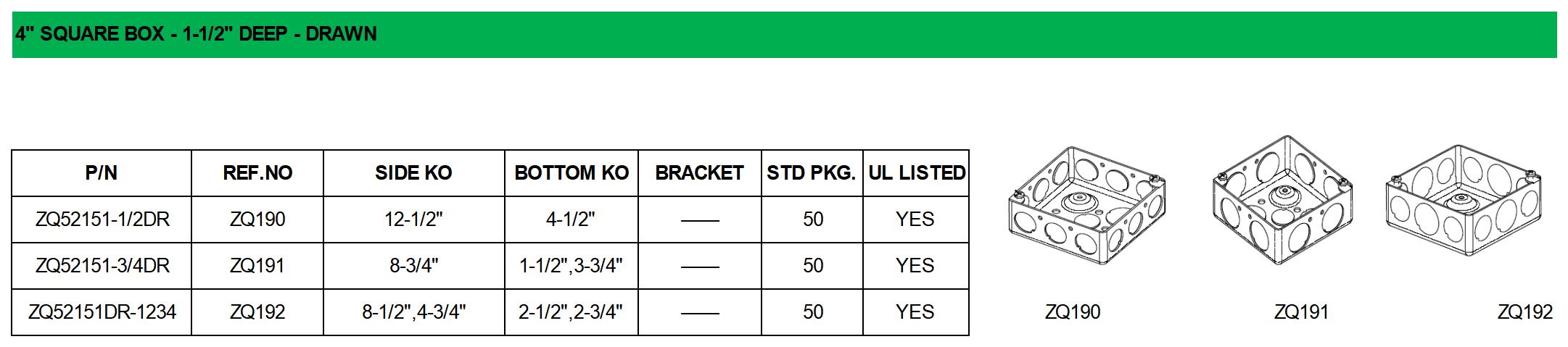 • 4″ square drawn junction boxes can be installed in walls or ceilings for lighting fixtures, switches, receptacles or other outlet devices.