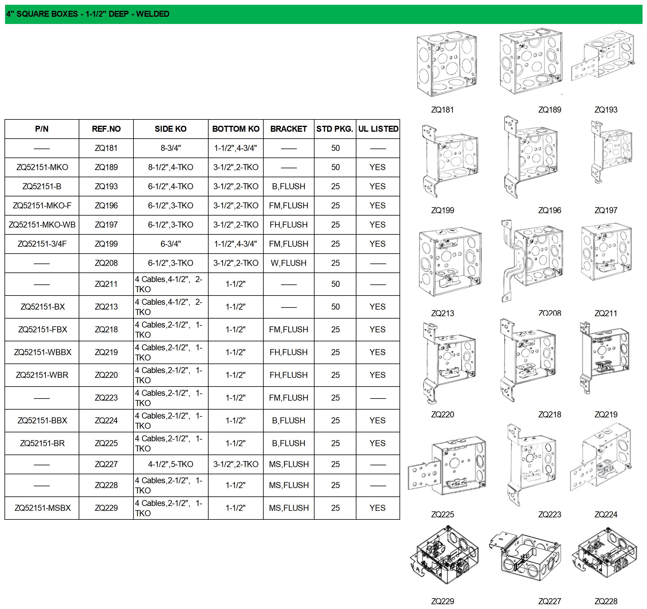 • 4″ square welded junction boxes can be installed in walls or ceilings for lighting fixtures, switches, receptacles or other outlet devices