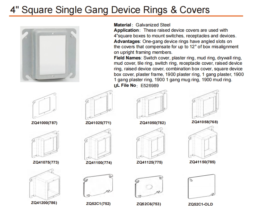 Field Names: Switch cover, plaster ring, mud ring, drywall ring, mud cover, tile ring, switch ring, receptacle cover, raised device ring, raised device cover, combination box cover, square device box cover, plaster frame, 1900 plaster ring, 1 gang plaster, 1900 1 gang plaster ring, 1900 1 gang mug ring, 1900 mud ring.