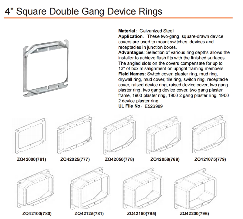 Field Names: Switch cover, plaster ring, mud ring, drywall ring, mud cover, tile ring, switch ring, receptacle cover, raised device ring, raised device cover, two gang plaster ring, two gang device cover, two gang plaster frame, 1900 plaster ring, 1900 2 gang plaster ring, 1900 2 device plaster ring.