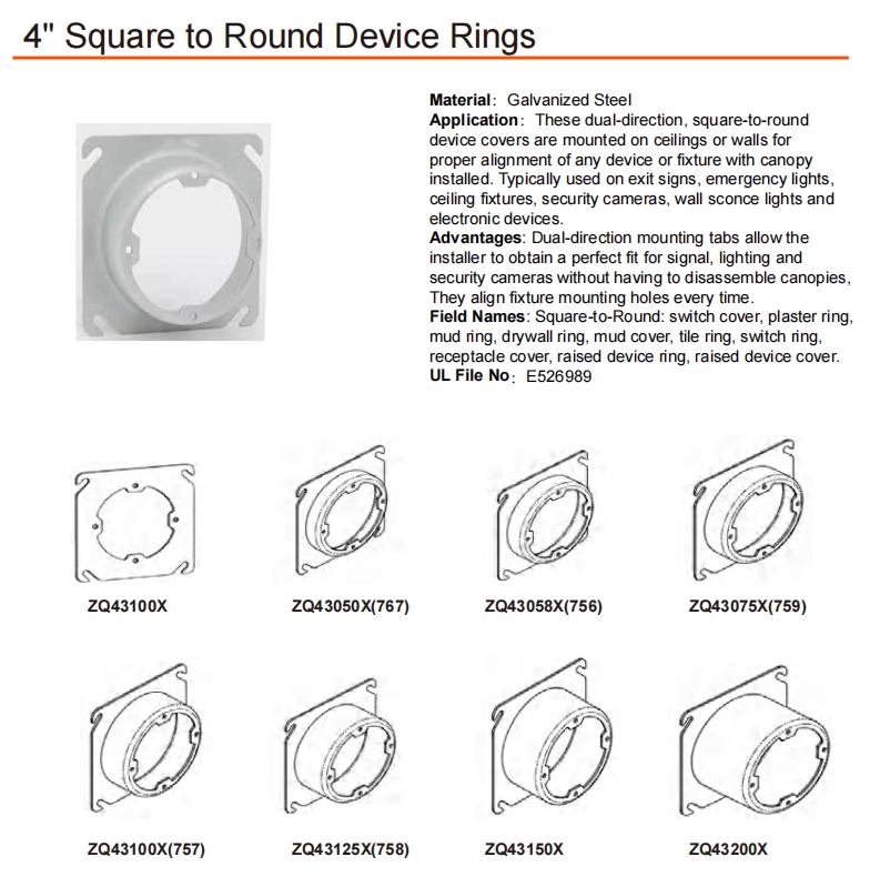 Field Names: Square-to-Round: switch cover, plaster ring, mud ring, drywall ring, mud cover, tile ring, switch ring, receptacle cover, raised device ring, raised device cover.