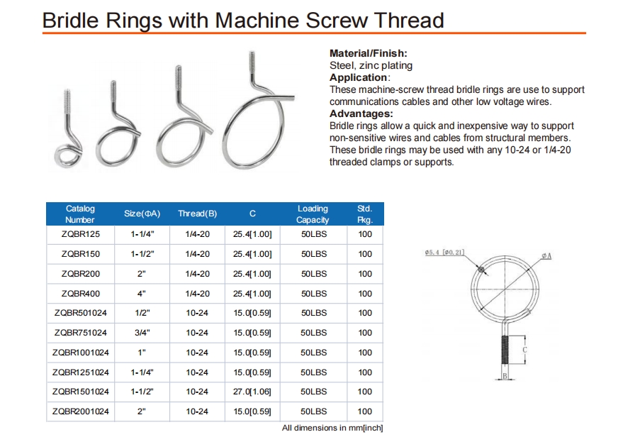 These machine-screw thread bridle rings are use to support communications cables and other low voltage wires.