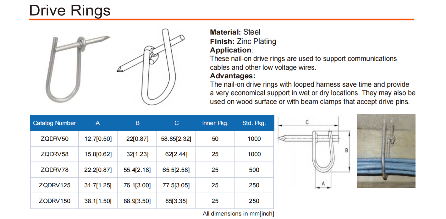 These nail-on drive rings are used to support communications cables and other low voltage wires.