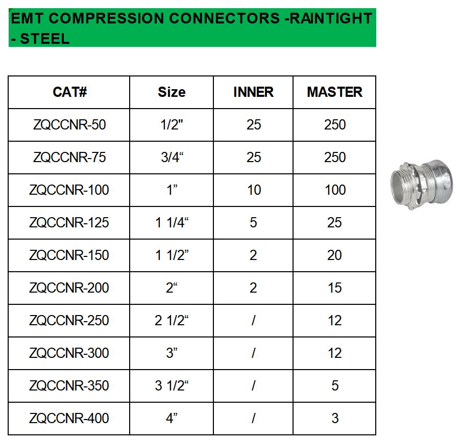 1. Application: These rain-tight compression connectors are used in wet locations to bond EMT thinwall conduits to electrical junction boxes or enclosures. Rain-tight EMT compression connectors have been designed to comply with the new rain-tight test requirements along with the 2008 NEC 358.42 and 314.15 requirements.