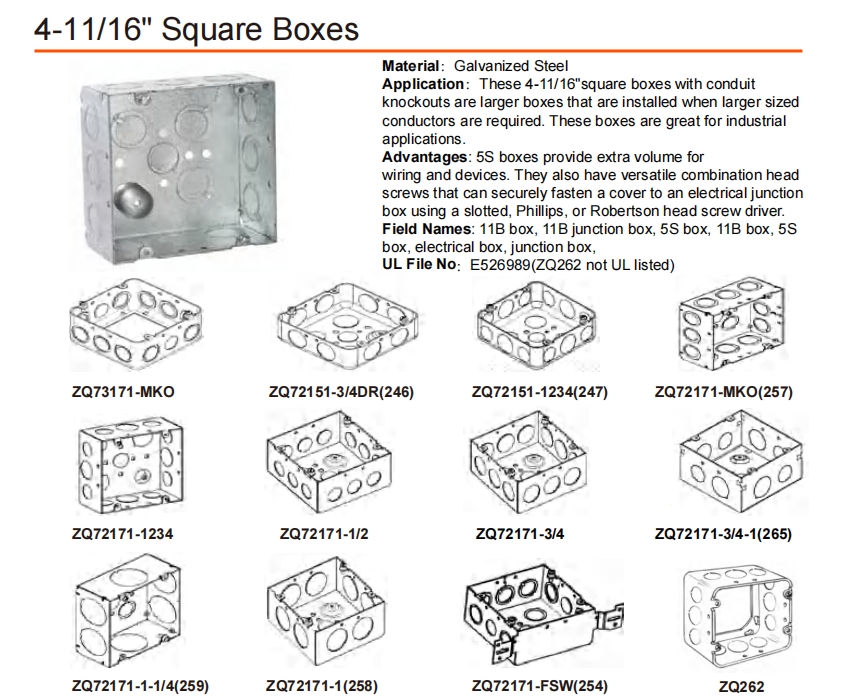 応用:これらの4 - 11/16 "コンジットノックアウト付きの正方形のボックスは、大きいサイズのときに取り付けられる大きなボックスです導体が必要です。これらのボックスは、産業用アプリケーションに最適です。