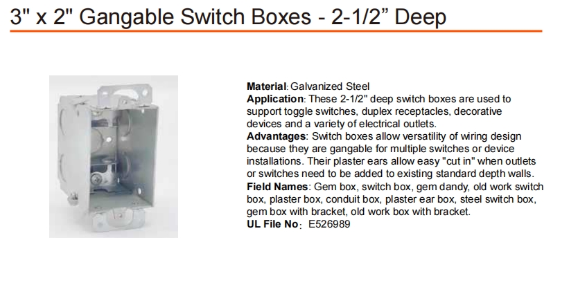 3 "x 2"ギャング可能なスイッチボックス- 2 - 1/2”深さ