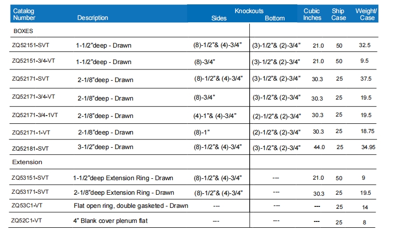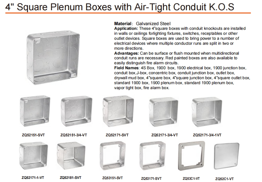 フィールド名:4Sボックス、1900ボックス、1900エレクトリックボックス、1900ジャンクションボックス、コンジットボックス、J -ボックス、同心箱、コンジットジャンクションボックス、アウトレットボックス、乾式壁泥ボックス、4インチの正方形の箱、4インチの正方接合ボックス、4インチの正方形のアウトレットボックス、標準1900ボックス、1900プレナムボックス、標準1900プレナムボックス、蒸気タイトボックス、火の警報ボックス。