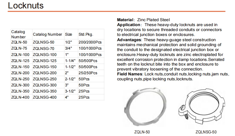 利点:これらの重い-ゲージ鋼構造は、指定された電気ジャンクションボックスまたはエンクロージャへの導管の機械的保護と固体接地を維持します。ロックナットの鋸歯状の歯は、箱とエンクロージャーに噛み付き、接続の振動緩みを防ぎます。