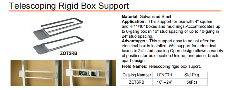 利点:このサポートは、電気ボックスが取り付けられた後に簡単に調整できます。 24インチのスタッド間隔で4つの電気ボックスをサポートします。オープンデザインは、ボックスの場所にさまざまな位置を可能にします。
