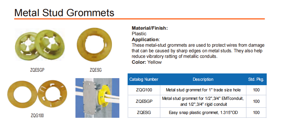 These metal-stud grommets are used to protect wires from damage that can be caused by sharp edges on metal studs.They also help reduce vibratory ratting of metallic conduits.