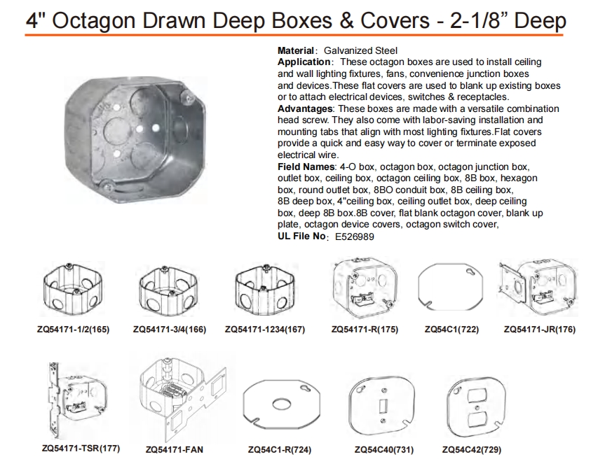 Имена поля: 4 - O Box, Octagon Box, Octagon Junction Box, выпускная коробка, потолочная коробка, потолочная коробка восьмиугольника, 8b коробка, шестигранникКоробка, расточка для выходов, 8BO Conduit Box, 8b потолочная коробка, 4B Deep Box, 4 -дюймовая потолочная коробка, потолочная коробка, глубокий потолокBox, Deep 8b Box.8b Крышка, плоская пустая крышка восьмиугольника, пустая пластина, крышка для устройства восьмиугольника, крышка восьмиугольника.