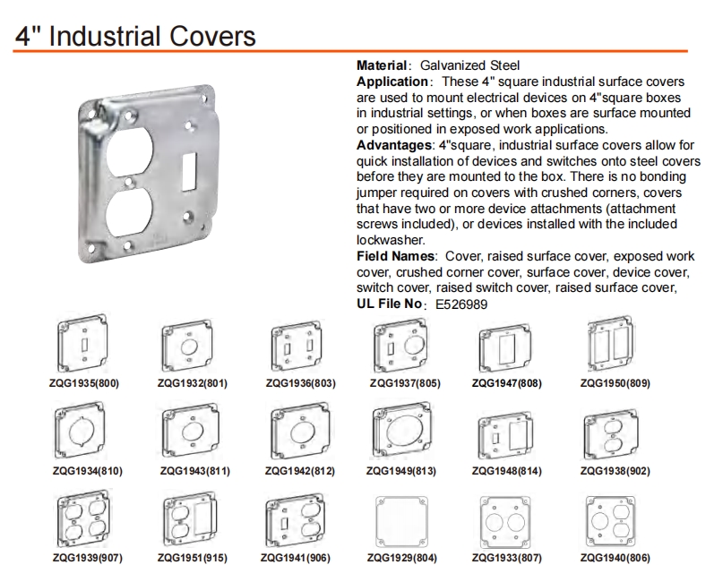 Преимущества: 4 -дюймовые квадратные, промышленные поверхностные крышки позволяют быстро установить устройства и переключатели на стальные крышки, прежде чем они будут установлены на коробке. На крышках не требуется склеивающая перемычка, накрытые крышки, на крышках, которые имеют два или более вложений устройства (включали винты с прикреплением) или устройства, установленные со включенным замком.