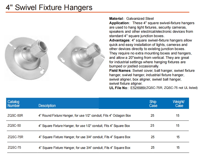 Приложение: Эти 4 -дюймовые квадратные повороты - вешалки для приспособления используются для подвешивания светильников, камер безопасности, динамиков и других электрических/электронных устройств из стандартных 4 -дюймовых квадратных соединительных коробок.