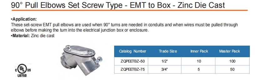 Эти набор - Винт EMT Tult Leckles используются, когда в проводниках требуются повороты 90 °, и когда провода должны быть протянуты через локти, прежде чем превращать поворот в электросвязанную коробку или корпус.