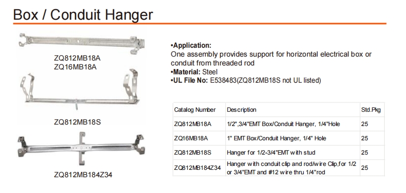 Одна сборка обеспечивает поддержку для горизонтальной электрической коробки или трубопровода из резьбового стержня.