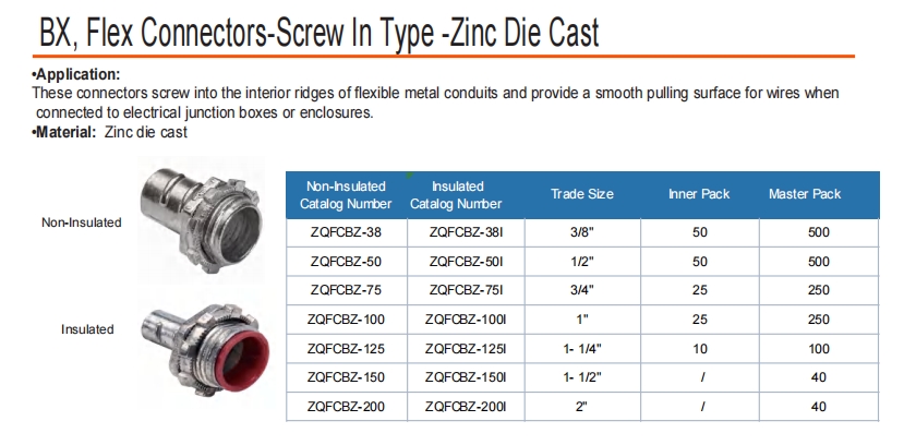 Эти разъемы вкручиваются во внутренние хребты гибких металлических каналов и обеспечивают гладкую поверхность потягивания для проводов при подключении к электрическим соединительным коробкам или корпусам.