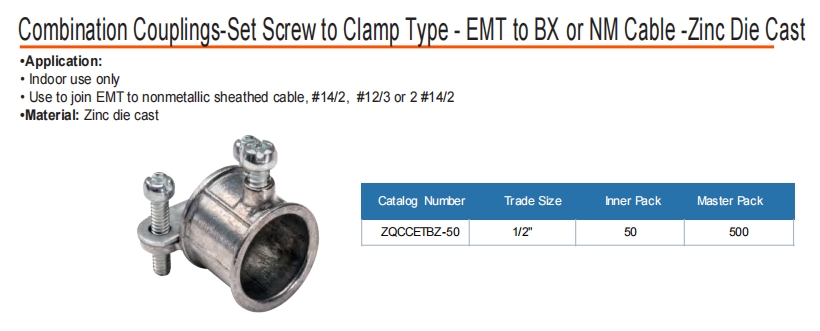Комбинированные муфты - Установить винт к типу зажима - Emt to bx или nm -кабель - Zinc Die Cast