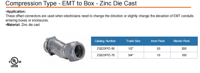 Эти смещенные разъемы используются, когда электрики необходимо изменить направление или слегка изменить высоту проводников EMT, входящих в ящики или корпуса.