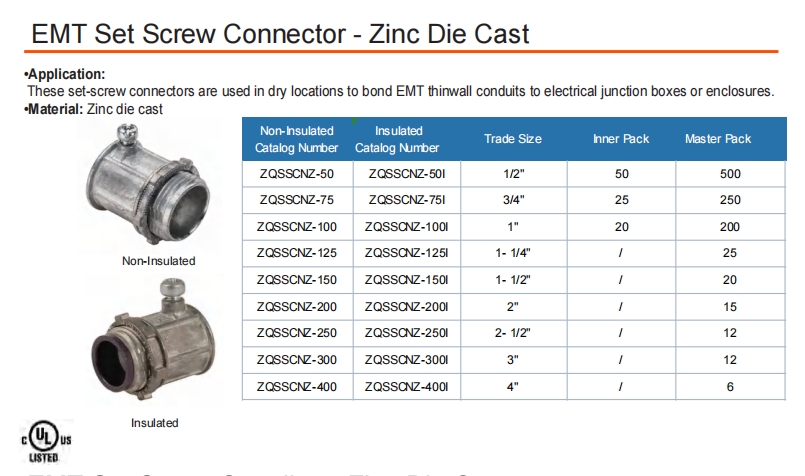 Эти набор - винтовые разъемы используются в сухих местах, чтобы связать Thinwall Conduits EMT с электрическими соединениями или корпусами.