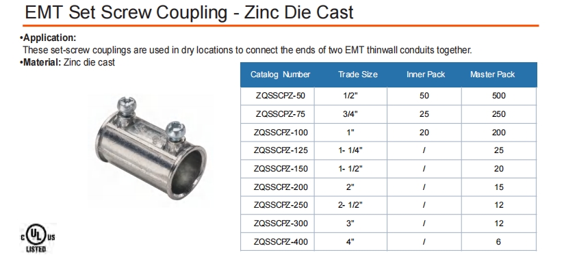 Эти набор - винтовые муфты используются в сухих местах, чтобы соединить концы двух изделий EMT Thinwall вместе.