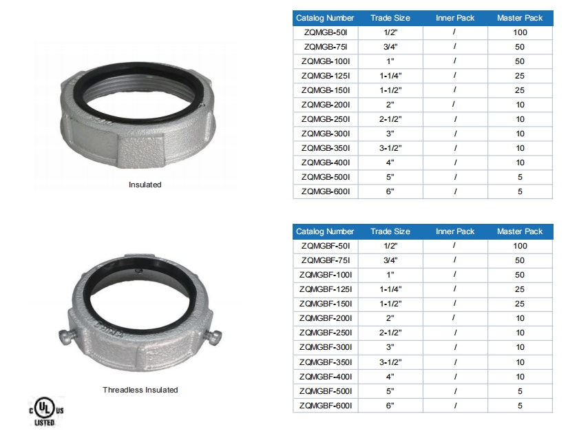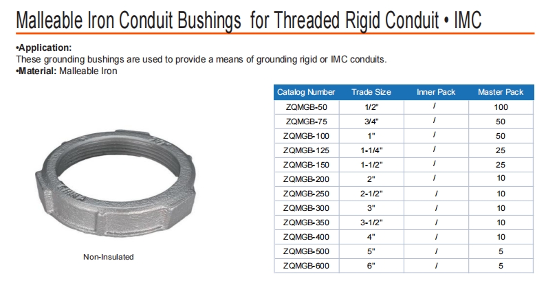 Эти заземляющие втулки используются для обеспечения средств заземления жестких или IMC -каналов.