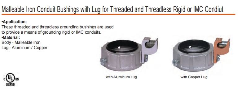 Эти резьбовые и бесконечные заземляющие втулки используются для обеспечения средств заземления жестких или IMC -каналов.