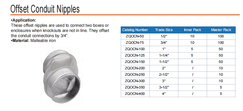 Эти смещенные соски используются для подключения двух ящиков или корпусов, когда нокауты не находятся в очереди. Они компенсируют соединения трубопровода на 3/4 ».