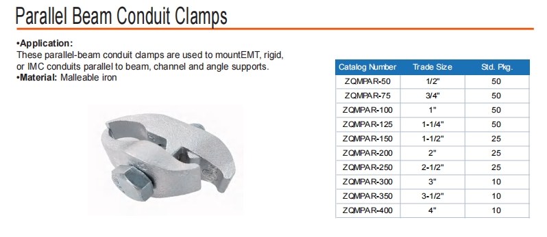 Эти параллельные - зажимы в луче используются для проведения Hountemt, жесткого или IMC, параллельными балкам, каналам и угловым опорам.