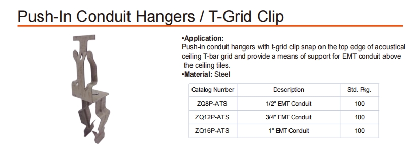 Толкайте - В вешалках для трубопроводов с зажимной сеткой на верхнем краю акустического потолка T - Bar Grid и обеспечивает средства поддержки каналов EMT над потолочными плитками.