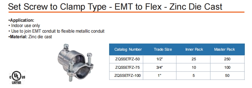 Установить винт к типу зажима - Emt to flex - Цинк умирает