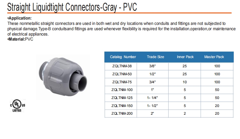 Эти неметаллические прямые разъемы используются как во влажных, так и в сухих местах, когда проводники и фитинги не подвергаются физическому повреждению. Продолжаемые каналы и фитинги используются всякий раз, когда требуется гибкость для установки, работы или обслуживания электрических приборов.