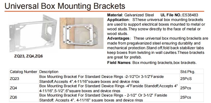 Применение: эти универсальные монтажные кронштейны используются для поддержки электрических коробок, установленных на метал или