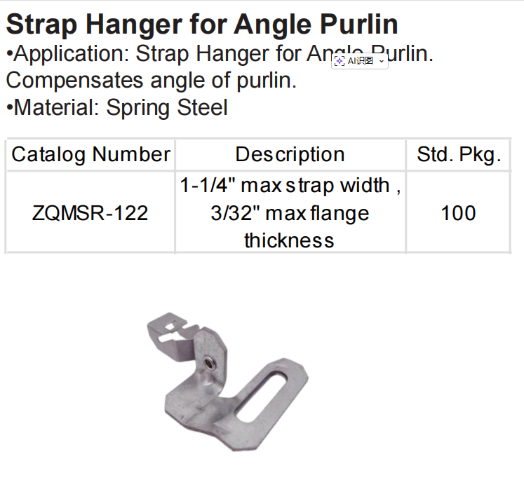 - Application: Strap Hanger for Angle Purlin. Compensates angle of purlin.